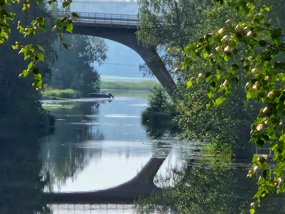 koivunlehdet, vain osittain näkyvä silta sekä veden pintaan rikkoutuva varjo.